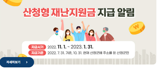 산청군 재난지원금은 2022년 11월 1일 부터 2023년 1월 31일까지 신청 가능합니다.