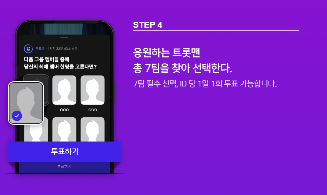 불타는 트롯맨 투표 방법은 대국민 투표도 함께 진행됩니다. 본선 진출하게된 참가자들에게 한해서 진행됩니다. 결승에서 반영되는 점수이기때문에 지지하는 참가자에게 미리 투표하세요. 하루에 한번, 7명까지 중복하여 투표 되니 참고하시길 바랍니다. . 매주 화요일밤 9시 10분에 대국민 투표 결과가 방송됩니다.