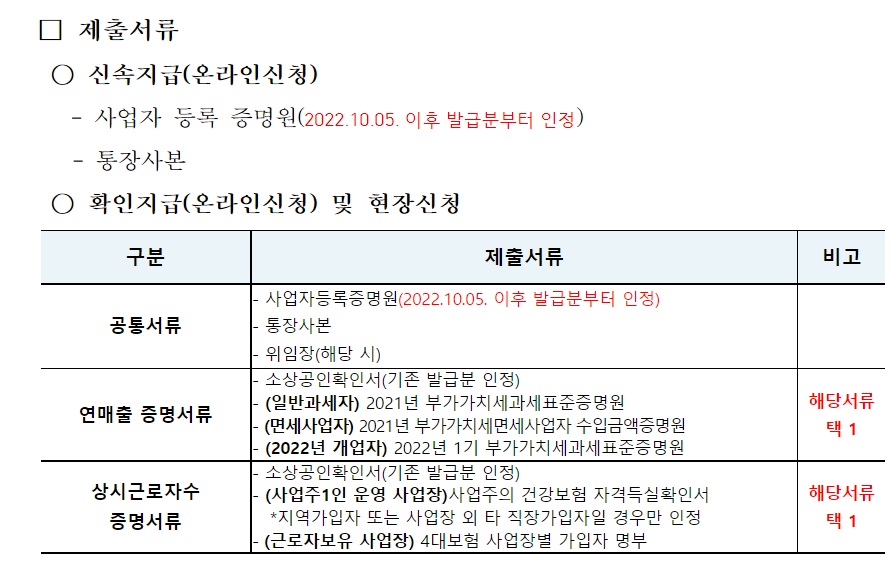 다음으로 오프라인 신청방법은 22년 10월 24일부터 31일까지로 사업자등록증의 주소지를 기준으로 행정복지센터를 방문해주시면 됩니다. 오프라인 신청을 할 때에는 필요한 서류가 있습니다. 오프라인으로 신청할때만 필요한 다양한 서류들이 확인하시고 빠뜨리지 않도록 주의하시길 바랍니다.