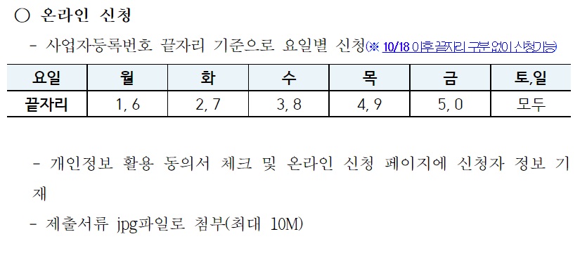 일상회복 지원금 신청방법에는 온라인 신청방법, 오프라인 신청방법으로 두 가지가 있습니다. 먼저 온라인 신청방법은 신청기간이 22년 10월 11일부터 31일까지입니다. 신청하는 곳은 화성시청 홈페이지로 들어가 보시면 "비상경제 민생안정 지원 대책 바로가기" 가 있는데 그 곳에서 신청하면 됩니다. 참고로 신속 지급 대상자는 문자가 발송 되었을텐데, 온라인신청만 가능하다고 하니 참고해주시길 바랍니다. 또한 온라인 신청을 할때에는 사업자등록번호 마지막 자리를 기준으로 요일별로 신청하게 되니 밑에 표를 참고해주시길 바랍니다.