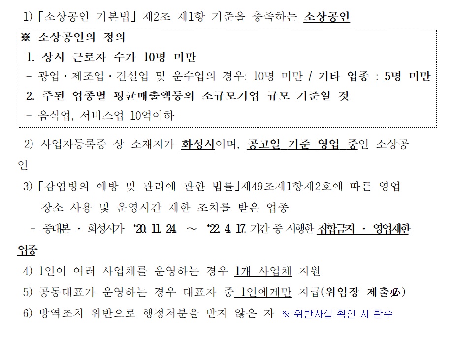 화성시 소상공인 일상회복지원금 신청대상