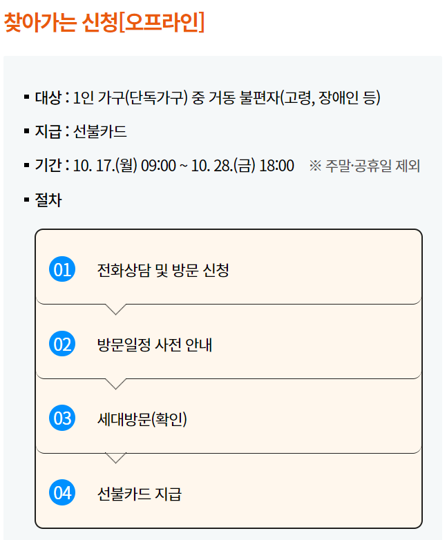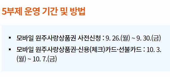모바일 원주사랑 상품권의 신청기간은 9월 26일 월요일부터 10월 31일 월요일까지이며, 신용,체크카드 포인트의 신청기간은 10월 3일 월요일부터 10월 31일 월요일까지입니다. 선불카드는 10월 3일 월요일부터 11월 4일까지이며, 찾아가는 신청 서비스는 10월 17일 월요일부터 10월 28일 금요일까지 신청을 받는다고 합니다.