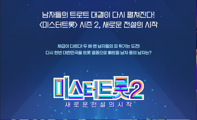 TV조선에서 방송하고 있는 미스터트롯2가 22년 12월 22일 목요일 밤 10시 첫방송을 시작하였고, 20.2프로의 시청률을 달성하면서 화려한 막을 올렸습니다. 첫 방송부터 참가자들이 매력을 마음껏 뽐내며 시청자들의 마음을 또 한번 설레게 하고 있습니다. 수많은 참가자들 중 누가 우승을 하게 될지 기대가 됩니다.
