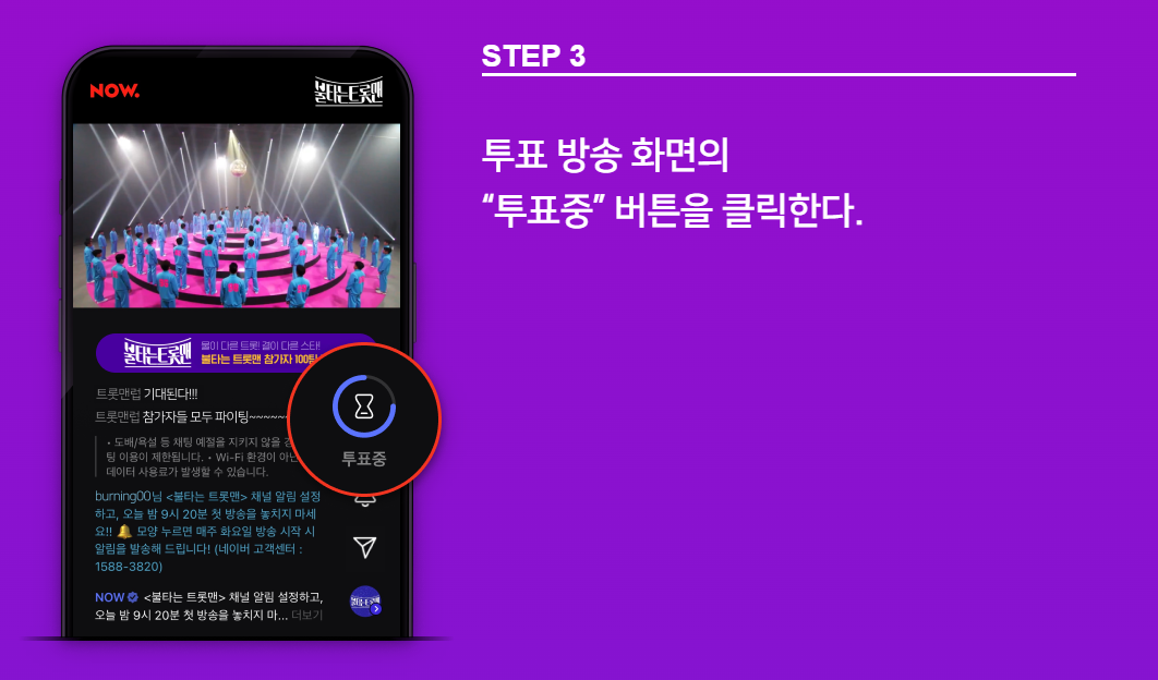 불타는 트롯맨 투표 방법은 아래 빨간색버튼 불타는 트롯맨 투표하기를 클릭해서 로그인 한다음에 투표하면 됩니다. 로그인은 네이버ID로 가능합니다. 지지하는 참가자를 찾아서 하트를 클릭하시면 투표가 완료 됩니다 .