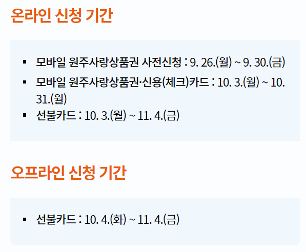 모바일 원주사랑 상품권의 신청기간은 9월 26일 월요일부터 10월 31일 월요일까지이며, 신용,체크카드 포인트의 신청기간은 10월 3일 월요일부터 10월 31일 월요일까지입니다. 선불카드는 10월 3일 월요일부터 11월 4일까지이며, 찾아가는 신청 서비스는 10월 17일 월요일부터 10월 28일 금요일까지 신청을 받는다고 합니다.